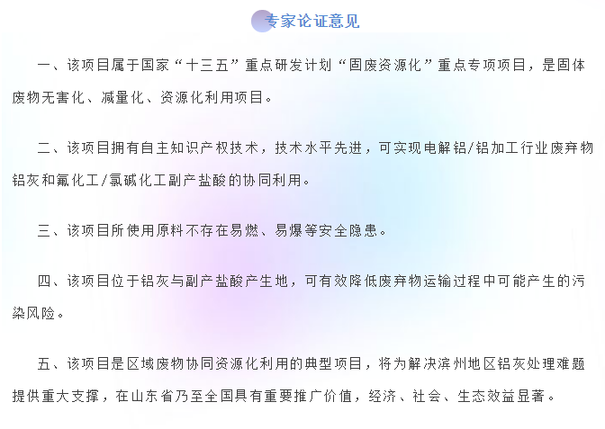與會專家聽取了建設企業及技術團隊對技術總體情況的匯報。在充分質詢、討論后,專家一致認為,本項目技術路線合理、前期基礎扎實,可實現電解鋁/鋁加工鋁灰和副產鹽酸的協同利用,屬典型的資源循環利用項目。